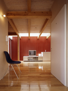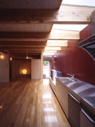 ベンガラの上にはトップライトがありさんさんと光が入ります。夜は外からのスポットライトでキッチンを照らします。