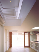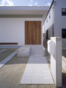 平屋の特製を活かし屋根が浮かんでいるような感じにしています。風を通す窓として壁の下のほうにスリットを設けて、開閉式の扉を設けています。