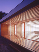 南側には奥の深いデッキがあり、木製の外部用ブラインドを付けています。