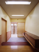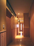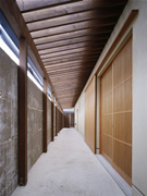 北側のアプローチ。床はたたき、塀は版築塀を模したコンクリートの塊。上部からやさしい光が落ちてくる。