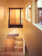ロフトから吹き抜けを見下ろす。旧家屋の木製ガラス戸が再利用されています。