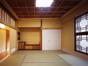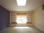 旧家屋の格子天井の板、床の間の棚、異国的なデザインの透かし彫りや硝子戸をもちいて、座敷を再構築した。
